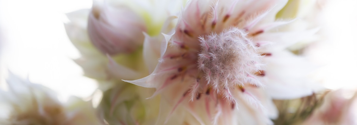 An up-close look at a Blushing Bride Protea flower, native to South Africa.